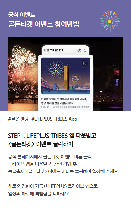 명실공히 최고의 불꽃명당은 뭐니뭐니 해도 '골든티켓' 좌석입니다. '골든티켓'좌석은 불꽃이 터지는 바지선과 무대가 정면으로 보이는 명당 중에 명당입니다. 골든티켓 좌석은 '골든티켓 이벤트'를 통해서만 얻을 수 있는 행운의 자리입니다. 올해 골든티켓 이벤트도 9.2(월) 부터 9.22(일)까지 진행되니 놓치지 마세요!