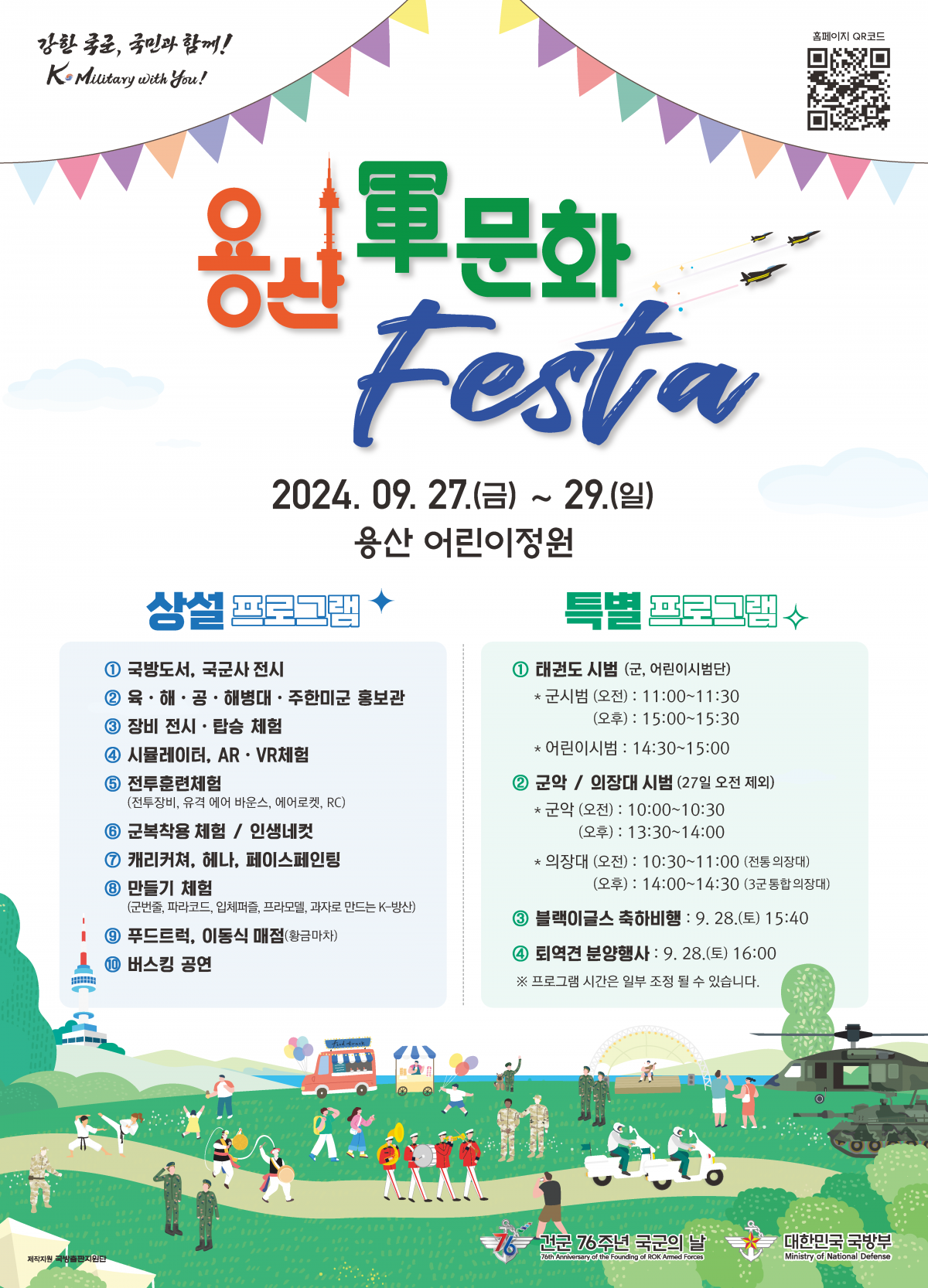 건군 76주년을 맞이하여 9월 10월 전국에서 군 관련 행사가 진행됩니다. 그 중에 군행사 하면 어린이 체험 행사가 빠질 수 없죠. 오늘은 국군의 날 행사 기획의 일환으로 진행되는 용산 군문화 페스타에 대해 소개하겠습니다.