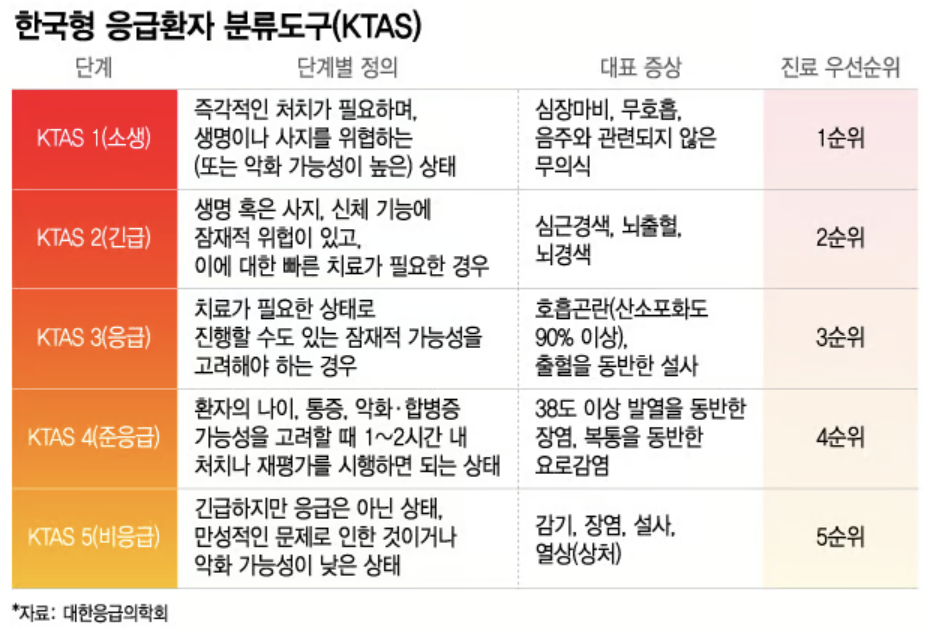 ※ 마지막으로 한국형 응급혼자 분류도구(KTAS)를 공유합니다. 그러나 일반인이 이걸로 증상을 판단할 수는 없으므로 추석연휴 응급상황 발생시 꼭 119에 문의하시길 바랍니다.